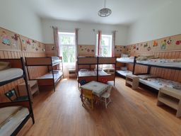 Im Kinderferiencamp Parkschlössl stehen 2 Wohneinheiten zur Verfügung, die außerhalb der Schulferien auf Gäste warten, die Urlaub oder Gruppenveranstaltungen planen. Bis zu 24 Personen werden bequem untergebracht. Jede Einheit ist mit 3 Schlafzimmern und ausschließlich Stockbetten ausgestattet. Mehrere Duschen und WCs sind außerhalb der Schlafzimmer. Es gibt 1-2 große Aufenthaltsräume sowie eine eigene Küchenzeile. Man betritt das Haus durch einen großzügigen Eingangsbereich. Der Garten mit 7000m² umrahmt das Haus. Geboten werden: Im Sommer ein Outdoor-Pool und Minipool, ein hauseigener Tennisplatz, ein Grillplatz und Spielplatz mit Sandkiste sowie eine große Wiese zum Toben oder Seele baumeln lassen mit Blick auf den Loser. Im Sommer schützen zahlreiche Bäume und ein Pavillon vor der Sonne. Im Winter können die Kleinen sogar im Garten Rodeln. Wer sich bewegen möchte, ist hier genau richtig. Die Anfahrt ist bequem und Parkplätze sind direkt am Gelände vorhanden.
